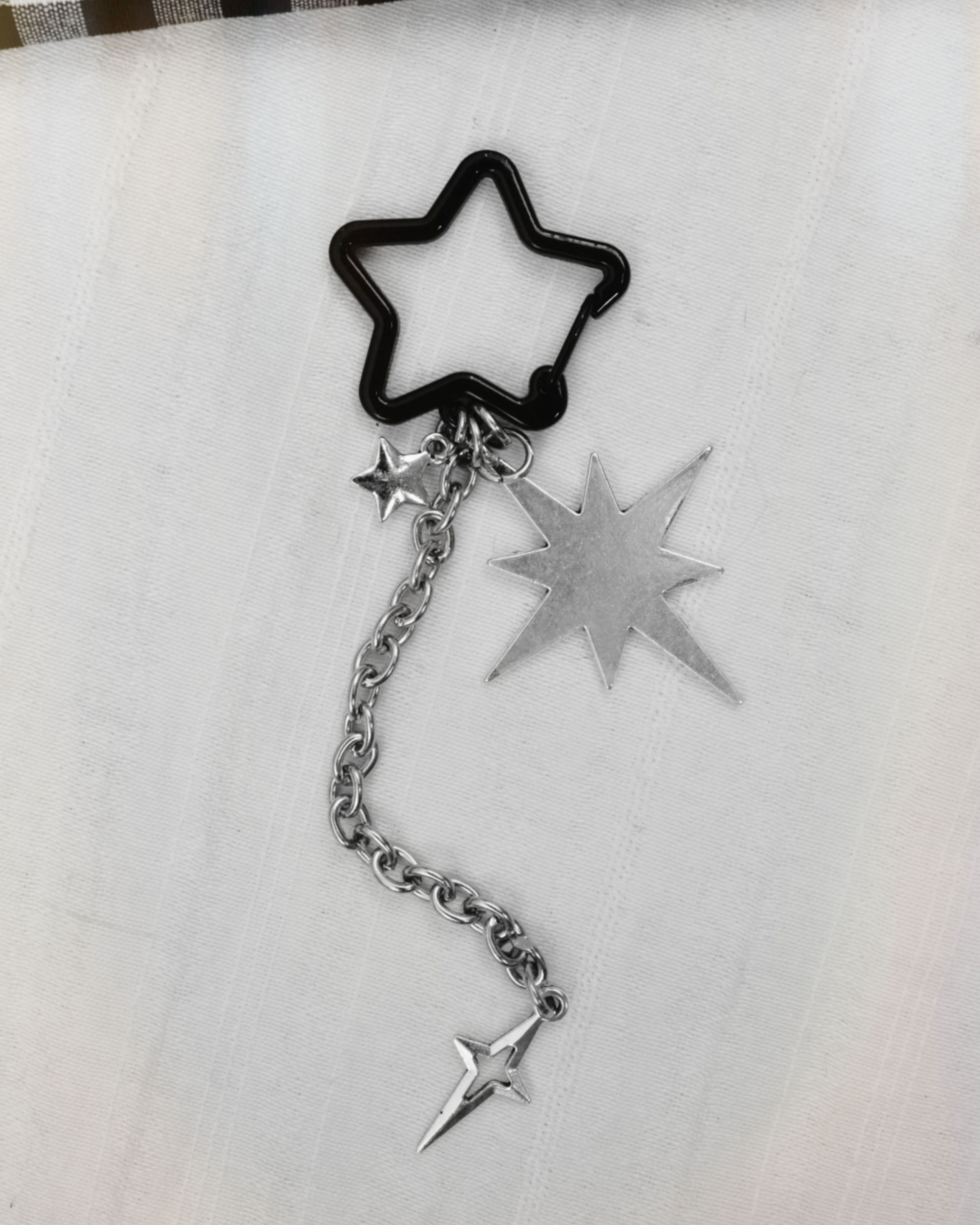 Llavero con mosqueton de hierro pintado de negro, cadena de acero quirúrgico y dijes de fundición