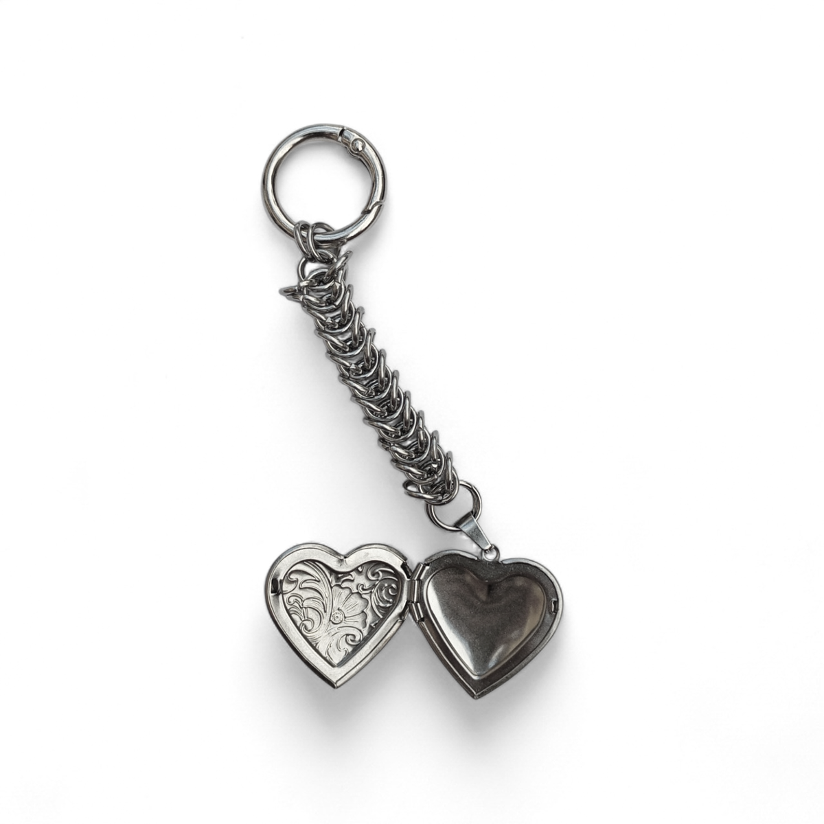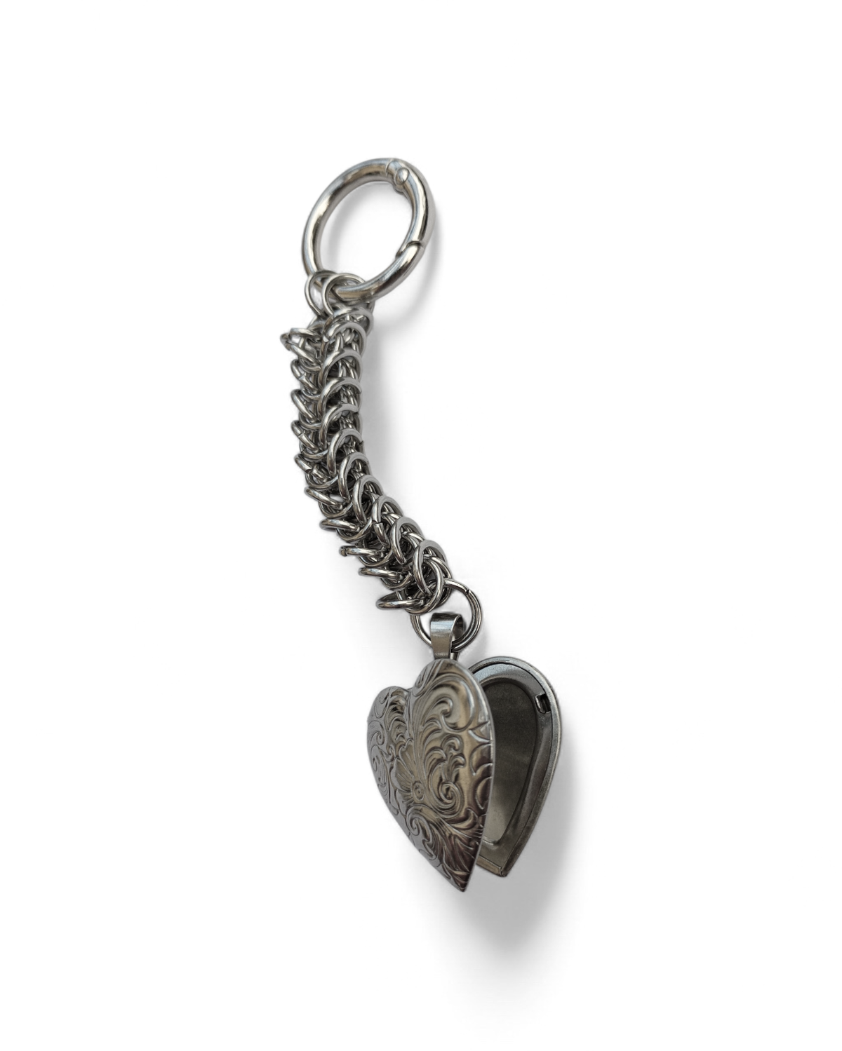 El dije es un relicario de acero quirúrgico.